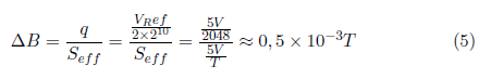 Una rutina en C++ programada en el microcontrolador ejecuta la conversión analógica-digital de la señal procedente del circuito sumador, sustrae por software el voltaje de 2,5V que se añade por hardware y obtiene el campo magnético con su respectiva polaridad, enviando el valor a una pantalla de cristal líquido. El algoritmo ejecutado por el microcontrolador se presenta en la Figura 7. La barra de error de las medidas de campo magnético del teslámetro se debe principalmente al error de cuantización q del convertidor analógico-digital, el cual corresponde a la mitad de la contribución del bit menos significativo de la conversión, como se muestra a continuación: