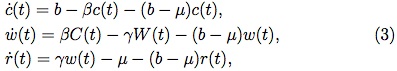 The linear system (2) can be solved analytically without using any transformation or special class function and closed analytical expressions are obtained which allows a more convenient analysis. Although there are few parameters in the model, the closed form solution is very long and not particularly illuminating so instead of writing it here we can just said that the main feature is as t → ∞ the solution approaches the equilibrium point (C*, W*, R*). However, for the particular case when the population is constant (b = μ), the closed form solution of the system (3) is the following,