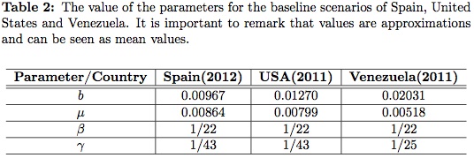 Different countries have different life expectancies, Social Security retirement ages, and starting work ages. Here we select values for these parameters based on previous studies, most of which focused on the OECD countries and international labor economic data [1],[7],[15],[16], [22],[23],[24]. The parameter values for the baseline scenarios of Spain, United States and Venezuela are shown in Table 2. We should note that these values are approximations and can be considered mean values. For Venezuela, we observe that the difference between the birth and death rates is large as is found in many Latin American countries. Thus, the total population size is growing quickly. On the other hand, the difference between the birth and death rates for Spain is small and a constant population may be assumed, as in many other European countries.