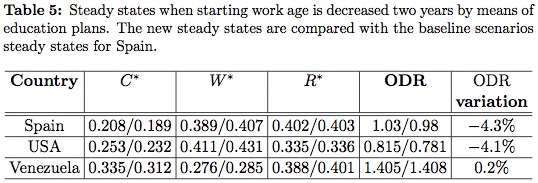 The numerical results regarding the old and new steady states are presented in Table 3 for each country . In addition, the variations in the old dependency ratio are presented. As can be observed in Table 3 the best results correspond to USA, since the old dependency ratio decreases to a very low value of 0.65. However, Venezuela achieves the maximum absolute variation with 0.27. Since USA population has younger population than Spain, an increase in age of retirement produces a low retiree population. In contrast, in Venezuela the retiree population decreases, but still high in relation to working population.