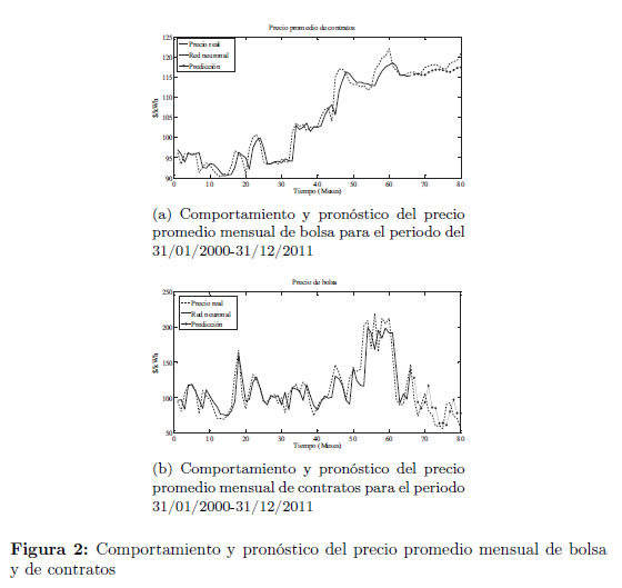 Finalmente, vale la pena resaltar el hecho que las redes neuronales de las Figuras 2a y 2b realizan un pronóstico promedio mensual en bolsa y contratos para el siguiente mes de estudio, es decir, éstas estiman cuáles serán los precios promedio para el próximo mes teniendo en cuenta los datos de precios promedio anteriores. Se selecciona una estimación mensual para reducir los errores de pronóstico puesto que la herramienta de predicción no incluye aspectos de formación de precio fundamentales (condiciones hidrológicas, pronóstico de demanda, expansión del sistema, etc.) que se deberían tener en cuenta para pronósticos de largo plazo.