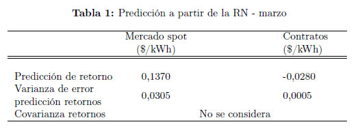 Este trabajo adapta ese modelo, para esto, en vez de calcular los retornos a través de sus históricos, la herramienta de predicción (RN) se emplea con el fin de estimar el siguiente valor de la serie y con este valor se estima un retorno; la varianza es calculada utilizando el error de predicción que arroja el estimador sobre sus valores históricos y la covarianza no es considerada toda vez que se asume que la estimación de una RN (por ejemplo para el mercado de contratos bilaterales) no afecta la estimación que realiza otra RN (por ejemplo para el mercado spot). Enfoques similares a este modelo se encuentran en [5], [6] y [7].