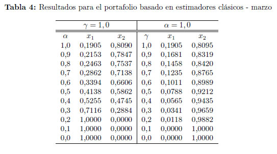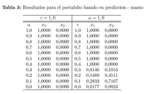 Existe un amplio contraste entre las Tablas 3 y 4 independiente de los valores γ y α, esta diferencia indica que formular un portafolio basado en predicción arroja resultados numéricos muy distintos a los resultados a través de un retorno basado en estimadores clásicos.