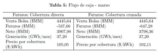 La segunda fila corresponde al ingreso por venta de energía del mercado spot, es decir, 37,2 GWh/mes a un precio promedio de $119,5/kWh durante el mes de marzo, la tercera fila es la liquidación de los contratos futuros (cobertura directa y cruzada), liquidados a un precio de $120/kWh el cual fue el precio de maduración del futuro [25], el neto es la diferencia entre las ventas y la liquidación del futuro y finalmente el precio por cobertura corresponde a la relación entre el neto y la generación. Observe la eficiencia de la cobertura toda vez que el precio es igual al precio cubierto para el caso de cobertura directa y muy cerca para el caso de la cobertura cruzada.