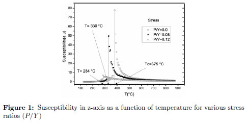 The susceptibility curves as a function of temperature are shown for various stress values in Figure 1.