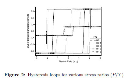 A decrease in intensity and critical temperature with increase of stress can be observed.This could be explained considering that in the Hamiltonian, the stress in the out-of-plane direction favored the dipole flipping into the in-plane, becoming z a hard axis of polarization and then reducing the formation of domains in the out-of-plane direction. The LGD (Landau- Ginzburg-Devonshire) theory estimates that for this kind of ferroelectric, a 100 MPa stress will shift the transition temperature by about 20 ◦C. In this matter, a systematic study of the ferroelectric properties of PZT nanowires was done by Hong and Fang [23] considering this thermodynamic approach. Two competing mechanisms had been proposed to explain this transition temperature shift. One, the uniaxial stress causes a distance diminution between dipoles and consequently an increase in ferroelectric coupling intensity leading to higher transition temperatures. On the other hand, uniaxial stress causes a movement of the Zr/Ti cation to a more symmetric position in the cell, reducing the dipole magnitude and the ferroelectric coupling in the out of plane direction, favoring in this way, the shift to lower transition temperatures. This is closely related to the variation of hysteresis loops with the applied stress, Figure 2. A reduction in their area with the increase of stress, and thereby, a decrease in the coercive field can be observed due to non easy alignment in z direction, Table 2. Experimental data on ferroelectrics and in particular on PZT systems coincide reasonable well with this simulated behavior [24],[25],[26],[27].