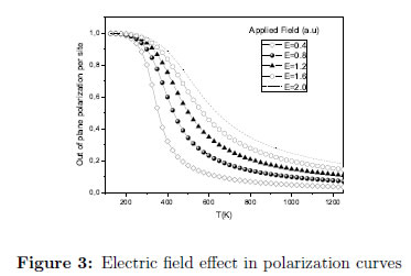On the other hand, the observed effect of an increasing field in the out-of-plane direction is the horizontal shift of the polarization curves, accompanied with higher values of polarization and minor deviating slopes, meaning a less defined critical temperature peaks for the corresponding susceptibility curves, Figure 3. The presence of the electrical field E term in the Hamiltonian Equation (1) favors the flipping of dipoles in the outof- plane direction, converting z in an easy axis of polarization. The abovee explains the formation of z-domains in a larger range of temperatures.
