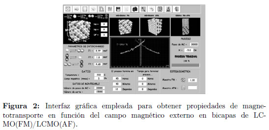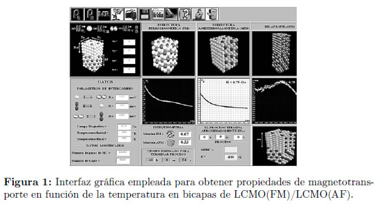 En las Figuras 1 y 2 se presentan la interfaces gráfica para el cálculo de la resistividad en bicapas FM/AF, construidas para calcular la resistividad en función de la temperatura y en función de campo magnético externo respectivamente. En estas figuras, en los paneles superiores, se presentan esquemas de las muestras simuladas con los tres tipos de iones magnéticos que componen el material. En los paneles inferiores izquierdo e inferior central se incluyen las ventanas empleadas para el ingreso de los parámetros, mientras que en los paneles centrales se presentan las gráficas producidas durante las simulaciones. En la parte superior de las interfaces gráficas se presentan los botones utilizados para realizar los procesos computacionales necesarios para la simulación, como son captura, almacenamiento y gráfica de datos entre otros. Por medio de estas interfaces se obtienen las diferentes curvas de resistividad como las presentadas en las Figuras 4, 3 y 5.