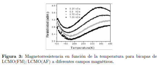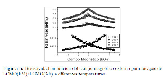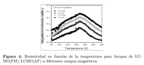 La Figura 3 presenta curvas de magnetorresistencia en función de la temperatura para bicapas de LCMO(FM)/LCMO(AF) a diferentes campos magnéticos externos. La magnetorresistencia presenta un máximo alrededor de la temperatura de transición, en done el sistema presenta la mayor eficiencia. Por otro lado, se observa un fuerte incremento de la MR con el campo; es decir, el material se vuelve mejor conductor. Nuevamente esto se debe a la alineación de los dominios en la dirección de campo, facilitando el salto electrónico entre iones magnéticos.