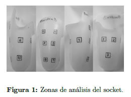 Las zonas donde fueron realizadas estas mediciones fueron seleccionadas a partir de los resultados de investigaciones previas [6], en las cuales se obtuvieron las zonas con mayor concentración de esfuerzos en la piel. En total se analizaron 6 sockets con un total de 72 probetas, cada una de ellas de un área aproximada de 100 mm2, dichas probetas se observan el la Figura 1.