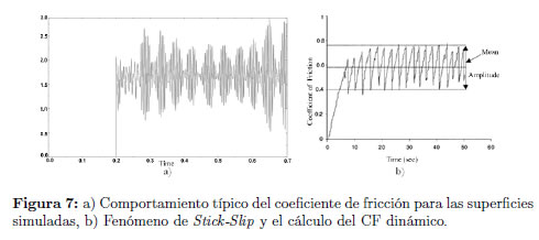 En este comportamiento se evidencia el fenómeno de Stick-Slip [46], (ver Figura7b) donde el movimiento no es constante si no que se desplaza una distancia dada y luego se detiene. Este es un comportamiento típico de la fricción de la piel, autores como Koudine et al [22] y Gitis y Sivamani [47] lo han evidenciado. El CF dinámico se calculó como el promedio de la amplitud de las mediciones realizadas en la zona de Stick-Slip [22], [47].