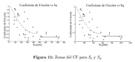 Analizando los resultados de otra manera, se pueden encontrar calramente dos zonas, la primera de éstas es la zona donde el CF depende significativamente del valor de los parámetros tribológicos, este comportamiento se puede apreciar hasta un valor de 500nm para la Sa y 600 nm para Sq, como se observa en la Figura 11.