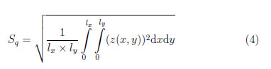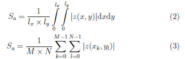 El parámetro Sa es conocido comúnmente como la rugosidad de una superficie referida al área analizada, y de forma análoga al Ra está definida como la media aritmética de los valores absolutos de las separaciones o alturas del perfil rugoso con respecto al plano medio del área medida A, esta área es la multiplicación de la longitud en x, lx; y su respectiva longitud en Y, ly. Matemáticamente está dada por la Ecuación (2). También puede definirse como se muestra en la Ecuación (3), donde los valores M y N corresponden al número de puntos medidos utilizando un AFM tanto en las coordenada x como en la coordenada y respectivamente.
