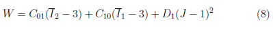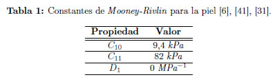 El modelo hiperelástico es uno de los más empleados para realizar simulaciones numéricas que involucren la piel [6], [25], [39], [40]; debido a que reproduce acertadamente la deformación sufrida al recibir una carga, entre los posibles modelos para este estudio se seleccionó el de Mooney-Rivlin, el cual se presenta en la Ecuación (8), y sus constantes presentan en la Tabla 1.
