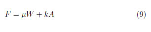 Donde F es la fuerza de fricción, μ es el CF, k es el coeficiente de adhesión superficial y A es el área de contacto; basados en los resultados de Koudine et al [22] se omite la componente adhesiva, la cual representa una pequeña parte del total del CF cerca al 10 %, así k = 0.