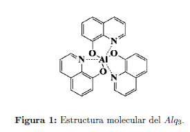 Uno de los materiales más usados como película electroluminiscente y transportadora de electrones en los OLEDs es el tris(8-hidroxiquinolato) de Aluminio Alq3. Este es un semiconductor orgánico de pequeña molécula con fórmula Al(C9H6NO)3, cuya estructura molecular se ilustra en la Figura 1. En esta molécula el grupo fenoxido forma los orbitales enlazantes tipo π, con un valor de HOMO (Highest Occupied Molecular Orbital) cercano a -5,6 eV, mientras que el grupo piridino forma los orbitales antienlazantes π*, con un valor de LUMO (Lowest Unoccupied Molecular Orbital) cercano a -3,1eV.[2]