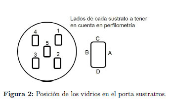 Inmediatamente después de la limpieza se procede a montar los sustratos en el porta sustratos, teniendo en cuenta las posiciones ilustradas en la Figura 2, donde se marcaron los vidrios ubicándolos en sentido de las manecillas del reloj. El cuadro a la derecha de la Figura 2 indica las diferentes posiciones sobre las que se realizó la medida de perfilometría para calcular el espesor.
