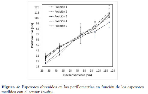 En la Figura 4 se presentan gráficamente los resultados obtenidos teniendo en cuenta los valores de espesor promedio medidos en cada posición, en función de los espesores prestablecidos y controlados con el sensor instalado in-situ al interior de la cámara de evaporación.