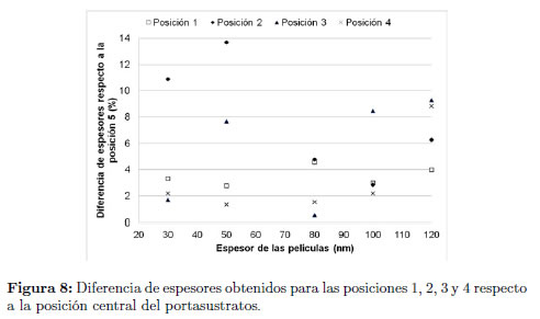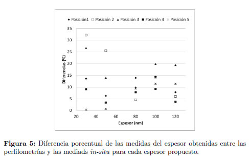 En la Figura 5, donde se ilustran las diferencias porcentuales entre las medidas del espesor obtenidas por perfilometrá y las controladas por el sensor de cuarzo, podemos observar que las mayores diferencias entre espesores se dan en las posiciones 2 y 3 (más alejadas del evaporador) donde se obtienen diferencias superiores al 25%. De esto se puede deducir que el espesor de las películas depositadas en las posiciones 1, 4 y 5, dado por el sensor in-situ, se aproxima mejor al valor real. La posición 5 arroja los resultados más confiables con diferencias menores al 5%, mientras las posiciones 1 y 4 presentan diferencias inferiores al 15%.