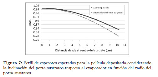 Teniendo en cuenta que el porta sustratos se encuentra inclinado 10 grados respecto al evaporador y asumiendo que la dirección preferencial de crecimiento de las películas se ubica en el centro del porta sustratos (posición 5), se espera que el perfil de espesores varíe respecto al perfil obtenido si se tuviera el porta sustratos paralelo al evaporador.