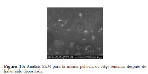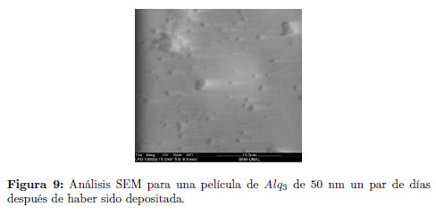 Además de las condiciones de evaporación, las propiedades electroluminiscentes del Alq3 dependen de su espesor, por lo que es importante controlar el crecimiento de las películas depositadas [5]. Por esta razón se montó un medidor de espesores in-situ que una vez calibrado permite adecuar y optimizar los parámetros de evaporación de las películas formadas. Para calibrar el sensor de espesores se realizaron medidas de perfilometría y para caracterizar las películas depositadas se realizó microscopía SEM (Scanning Electron Microscopy) y fotoluminiscencia.