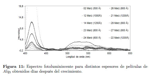 Al realizar medidas de fotoluminiscencia se pudo corroborar el degradamiento que sufren las películas. En la Figura 11 el espectro de fotoluminiscencia presenta dos picos: el primero corresponde a la luz con la que se fotoexcita el material y el segundo corresponde al emitido por el Alq3.