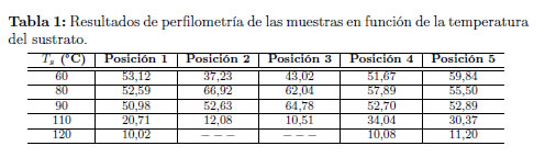 Fijando el espesor en 50 nm y la tasa de evaporación a 1;0 Å/s se varió la temperatura del sustrato Ts. En la Tabla 1 se recogen los resultados de los espesores obtenidos por perfilometrí a diferentes Ts en cada una de las posiciones.