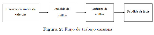 Se establecieron los flujos de trabajo de cada uno, y a partir de estos procesos y los flujos de trabajo se construyó el modelo de simulación del estado inicial del proyecto mediante el software Arena®. Se realizó la conceptualización del modelo partiendo de los flujos de trabajo establecidos, se definieron las actividades predecesoras para cada actividad y se tuvo en cuenta el desarrollo de cada uno de los procesos. A manera de ejemplo en la Figura 2 se presenta el flujo de trabajo de los caissons.