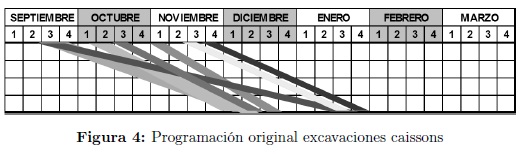 En la Figura 4 se visualiza la línea de balance realizada con base en la programación inicial para las excavaciones de caissons y en la Figura 5 se presenta la alternativa propuesta para estas excavaciones obteniendo una duración menor; esto se logró reduciendo holguras y tiempos muertos entre actividades, teniendo en cuenta la relación entre actividades y recomendaciones geotécnicas.