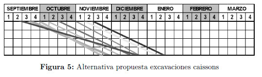 En la ejecución del proyecto se observó que la excavación de los caissons fue la actividad que mas afectó la duración del proceso constructivo debido a que se realizó manualmente, por consiguiente, seis de las alternativas propuestas están enfocadas a optimizar esta actividad.
