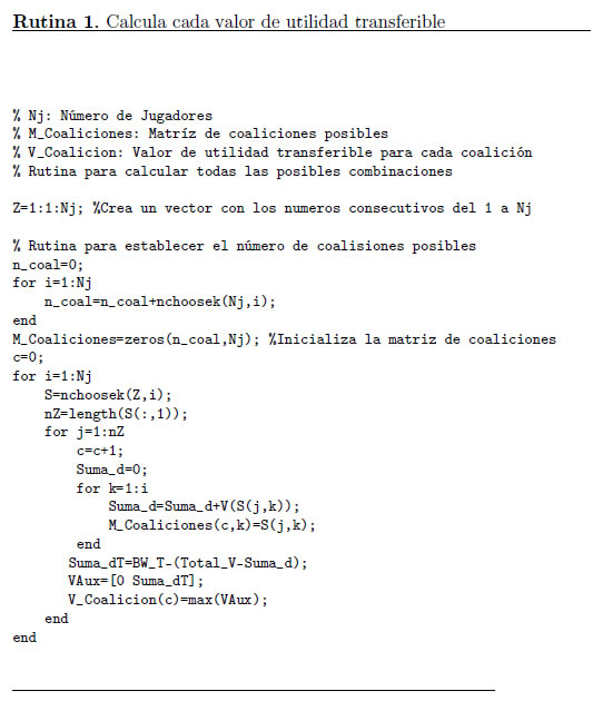 Tal como se mencionó anteriormente, se considerará un juego de bancarrota en coherencia con el estado de saturación del canal PLC, con el fin de calcular el valor de utilidad transferible para cada una de las coaliciones. La rutina elaborada en Matlab para realizar el cálculo de cada uno de los valores de utilidad transferible es la siguiente: