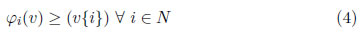 Con base en los valores v(S) registrados en la Tabla 2, es posible establecer cada una de las imputaciones del juego (N,v), teniendo en cuenta que se debe satisfacer el principio de individualidad racional φi (v) ≥ (vi) ∀i N y el principio de eficiencia ∑i