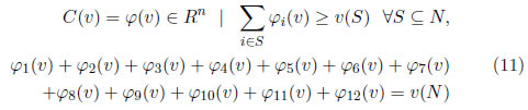 En el momento en el cual se exige a las imputaciones cumplir con el principio de racionalidad para todas las coaliciones, se llega al concepto introducido por Guilles denominado Núcleo [16]. El Núcleo C(v) de un juego (N,v), se define como el conjunto de imputaciones que poseen la propiedad racional de grupo. La expresión que define el núcleo de un juego obedece a la siguiente expresión :