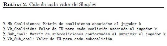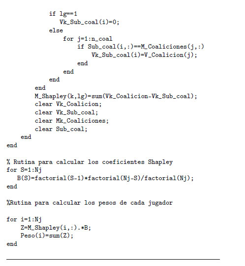 La rutina implementada en Matlab para calcular el valor de Shapley φk (v) ∀ k N es la siguiente: