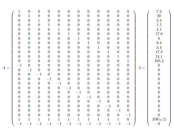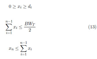Con el fin de evaluar el grado de optimización realizado mediante el uso del valor de Shapley, es necesario establecer un método alternativo de optimización que permita calcular el BW para cada nodo i, y con ello realizar posteriormente un proceso de comparación de tratamientos. Ante esta situación se decidio plantear el problema de asignación de recursos como un problema de Programación Lineal (PL). En vista de lo anterior, el problema se puede plantear de la siguiente forma (12) (13):