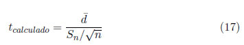 Para aceptar o rechazar las hipótesis planteadas se hará uso de la prueba denominada t pareada [21], la cual es utilizada comúnmente para evaluar la validez estadísitica de la diferencia entre dos muestras aleatorias. La expresión establecida para esta prueba estadística es la siguiente (17).: