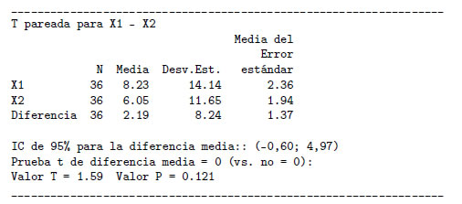 y d es la diferencia entre las variables X1 y X2. Para calcular el valor crítico (tcritico) se recurre al uso de Tablas de distribución t student con n−1 grados de libertad. Mediante el uso del programa estadístico Minitab [22] se realizo la prueba t pareada para las dos muestras con un ?=0,05 y 35 grados de libertad, acorde con los valores registrados en la Tabla 6, en donde se obtuvo el siguiente resultado: