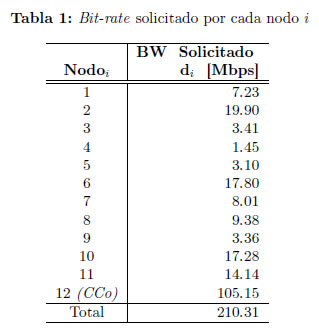 Para el escenario propuesto se ha considerado N=12 nodos que conforman la red PLC, un canal PLC en estado de saturación (BWT ≥ ) y un Bit-rate total disponible BWT=E=159.72 Mbps, el cual ha sido estimado mediante el uso de la herramienta GC_PLC. En la Tabla 1, se encuentra el valor correspondiente al Bit-rate solicitado (di) por cada nodo i que forma parte de la red PLC. Es importante mencionar que el proceso de optimización debe ser realizado para cada periodo HPAV equivalente a dos ciclos de red de la señal de potencia (120V/60Hz) [1], debido a las condiciones dinámicas de tráfico y de canal PLC que pueden estar presentes en la red. Para el caso particular, el nodo 12 cumplirá la función de nodo principal o Coordinador de la red PLC (CCo).
