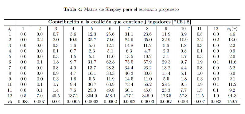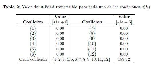 En la Tabla 2, se presenta el valor de utilidad transferible calculado para cada una de las coaliciones v(S) posibles, acorde al escenario propuesto en estado de saturación, bajo el uso del juego de la bancarrota. Teniendo en cuenta que el número de jugadores es 12 y el número de combinaciones posibles sería bastante elevado, solo se registrarán en la Tabla los valores correspondientes a v(i) y v(N). }