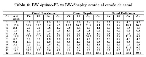 En la Tabla 6 se registran los valores correspondientes al BW óptimo-PL (PL), BW-Shapley (Sh), X1 y X2 que corresponden a la diferencia entre el BW solicitado por cada nodo (di) y el BW asignado a través de los métodos de PL y Shapley respectivamente; los cuales se encuentran asociados acorde a cada condición de canal específico.