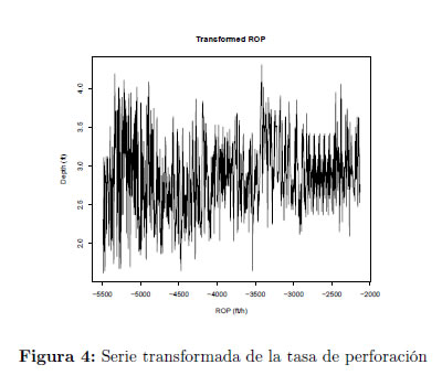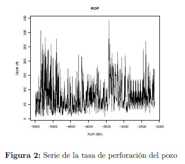 Considerando lo descrito en el párrafo anterior en la presente investigación se trabajó con la tasa de penetración (ROP) obtenida en el proceso de perforación de un pozo de referencia denominado V***, el cual se encuentra dentro del campo en desarrollo denominado VEL sobre la cuenca del Valle Magdalena Medio (VMM) en Puerto Boyacá, Colombia. La ROP fue medida cada 3 pies, comenzando el registro a una profundidad de 2132 pies y terminando a una profundidad de 5492 pies para un total de 1121 observaciones del proceso bajo estudio. Los gráficos y resultados que se presentan a continuación fueron obtenidos empleando la versión 3.1.3 del software estadístico R y sus paquetes strucchange, car, urca, fracdiff, arfima, TSA, pracma, fArma, lmtest y fBasics. En la Figura 2 se presenta la secuencia de observaciones de la tasa de perforación del pozo (V***).