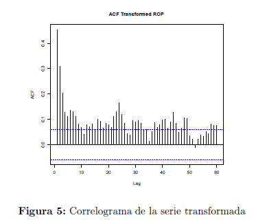 En el proceso bajo estudio no se observa ninguna tendencia determinística evidente en la serie de la ROP. Por otra parte, la varianza incondicional de la serie parece cambiar según el nivel del proceso lo que posiblemente indica que se deba realizar una transformación de potencia que permita estabilizar la varianza mencionada.