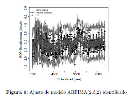 donde B es el operador de retardos y at es un proceso ruido blanco gaussiano de media cero y varianza constante. En la Figura 6 se presentan los valores ajustados por modelo ajustado y su intervalo de confianza del 95% a la secuencia de observaciones de la tasa de penetración ROP del pozo V***.