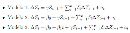 donde at es un ruido blanco gaussiano de media cero y varianza constante -at ∼ RBN(0,)-. Con la finalidad de probar la existencia de una raíz unitaria se deben contrastar las siguientes hipótesis según el modelo considerado en el estudio: