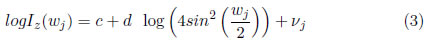 donde Iz(wj) es la j-ésima ordenada del periodograma de Zt, wj= es la j-ésima frecuencia de Fourier, νj es el término de error en la regresión, el cual se asume i.i.d de media cero y varianza constante
