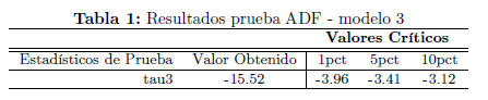 Al implementar la prueba ADF se consideró inicialmente la existencia de tendencia determinística y deriva. En la Tabla 1 se presentan los resultados obtenidos para esta prueba incluyendo un número máximo de retardos igual a la raíz cúbica de la longitud de la serie.