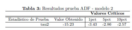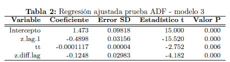 Considerando que la prueba anterior puede estar sobreparametrizada al incluir tendencia determinística (por su cercanía a cero), se especifica nuevamente la prueba ADF empleando el modelo 2, incluyendo un número máximo de retardos igual a la raíz cúbica de la longitud de la serie. En la Tabla 3 se presentan los resultados obtenidos.
