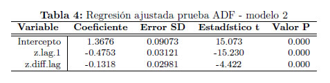 Se puede observar que solamente el primer rezago de la prueba ADF resultó estadísticamente significativo. Igualmente se puede concluir que la tendencia determinística resulta significativa aunque el valor del coeficiente estimado para la pendiente está cercano a cero.