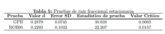 En la Tabla 5 se presentan los resultados de las pruebas de Geweke-Porter-Hudak y de Robinson empleando un ancho de banda de [] = [33.48] = 33