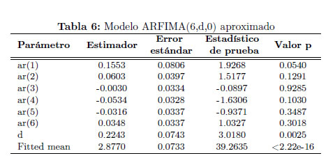 En la Tabla 6 se presentan los resultados del modelo autorregresivo aproximado de orden p*=≈ 6 ajustado empleando el paquete de R arfima (versión 1.2-7).